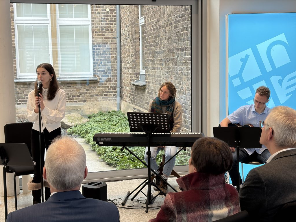 Nachdem ein Gesteck durch den Landtagsabgeordneten Oliver Krauß und den Bürgermeister Dr. Daniel Phiesel niedergelegt wurde, erklang das Lied „Imagine“ von John Lennon, das die Hoffnung auf Frieden, Menschlichkeit und ein respektvolles Miteinander über alle Grenzen hinweg in den Mittelpunkt stellte. Ein besonderer Dank gilt abschließend Frau Viktoria Geppert für die inhaltliche Vorbereitung und Begleitung des Wortbeitrags sowie Frau Anna Keller für die musikalische Gesamtleitung und die einfühlsame Gestaltung der Gedenkfeier.