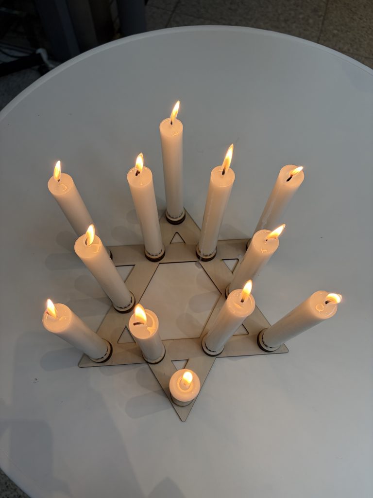 Die musikalische Gestaltung der Gedenkfeier übernahmen Schülerinnen und Schüler unserer Schulgemeinschaft. Fiona Müdder eröffnete die Veranstaltung mit dem jüdischen Begrüßungslied „Hine Ma Tov“, das den würdevollen Rahmen der Gedenkstunde unterstrich. Mit ihrem Gesang sorgte sie für besonders bewegende Momente, begleitet von Edgar Kriwankow (Jg. Q2) an der Gitarre. Ein zentraler Programmpunkt war der Wortbeitrag „Lichter der Erinnerung“, gestaltet von den Schülerinnen des aktuellen Abiturjahrgangs: Zoe Gernhardt, Caroline Heppner, Anna Wibel und Berenike Zimmer. In diesem Beitrag wurden ausgewählte Biographien von Opfern des Nationalsozialismus vorgestellt und durch das gemeinsame Entzünden von Kerzen lebendig gehalten. Die Kerzen wurden nacheinander auf einem selbstgebauten Davidstern entzündet – einem eindrucksvollen Symbol des Gedenkens. Dieser Davidstern, welcher von Herrn Joseph Fuhrmann gebaut wurde, wird für den besonderen Anlass graviert und dem Rathaus Rheinbach feierlich übergeben, um dort dauerhaft an die Opfer zu erinnern und das Gedenken im öffentlichen Raum sichtbar zu machen.