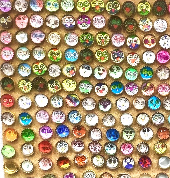 März 26: Gemeinschaftsprojekt Eulen von Schüler:innen am Standort 1: Kleine Eulen werden gezeichnet und in einen Kronkorken geklebt. Gemeinsam entsteht ein riesiges Wimmelbild.