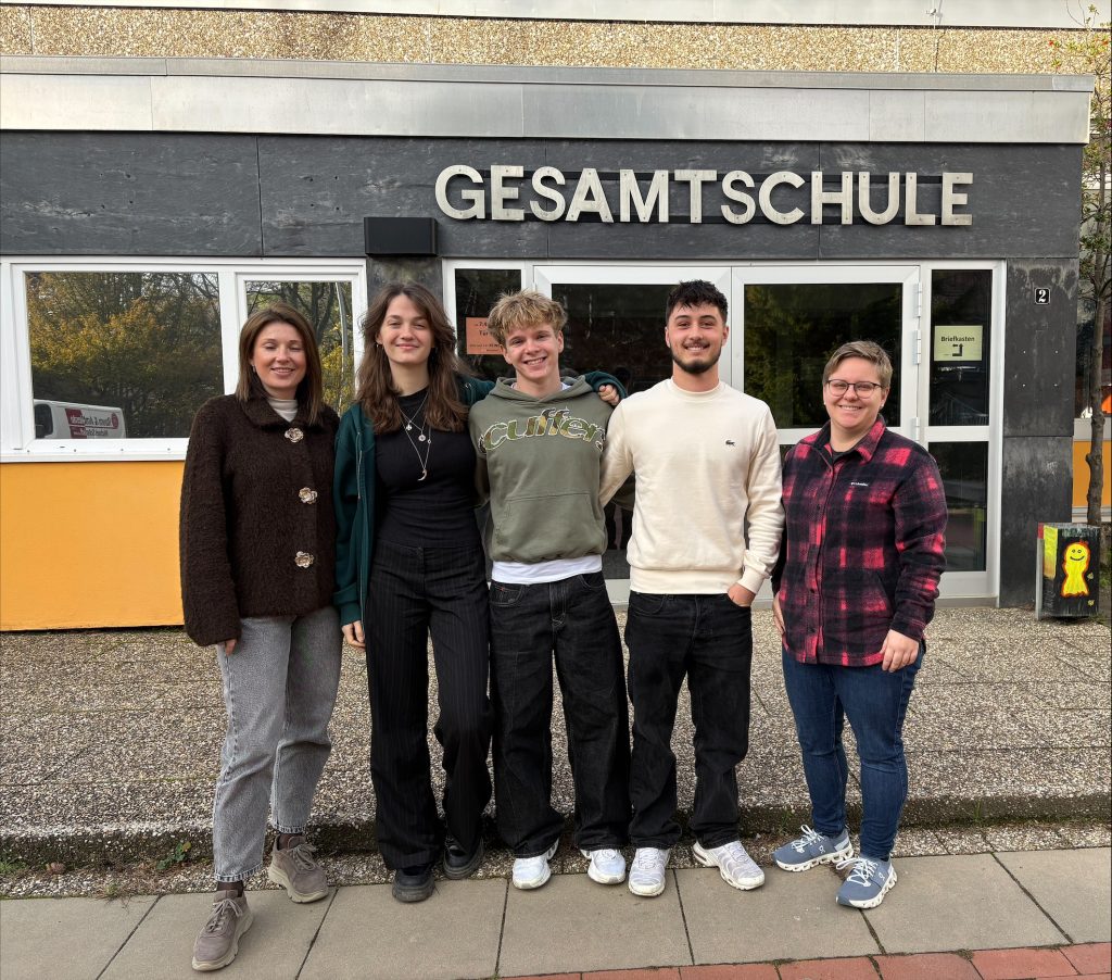 von links nach rechts: Frau Giel, Friederike Isaza, Fynn Stolpmann, Emil Paffenholz, alle aus der Q1 und Frau Goldhammer